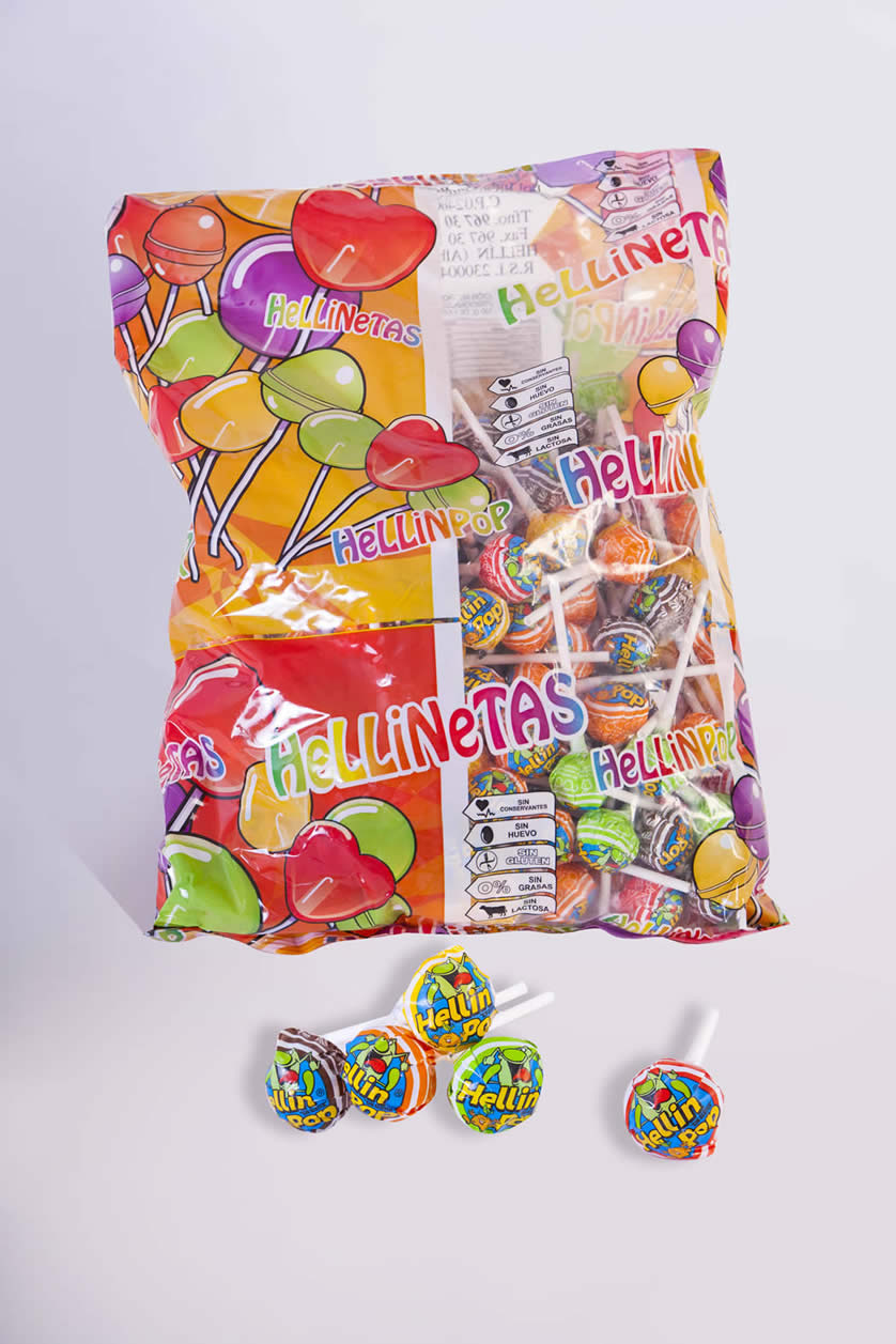 Chupa 8 gramos Sabores: Limón, Naranja, Cereza, Cola, Manzana. Cajas 7 bolsas Bolsas 200 unidades. Pallets 42 cajas.