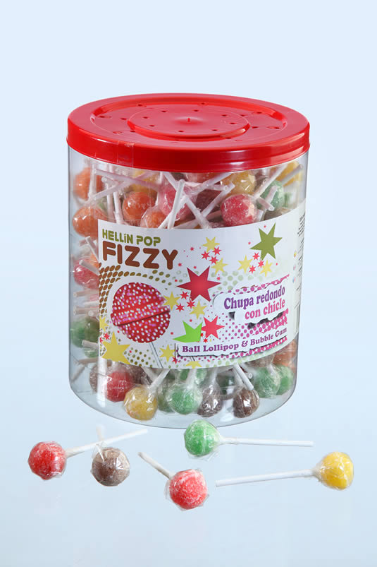 Chupa 9 gr relleno de chicle. Sabores Surtidos. Cajas 6 tarros. Tarros 200 unidades. Pallets 45 cajas.